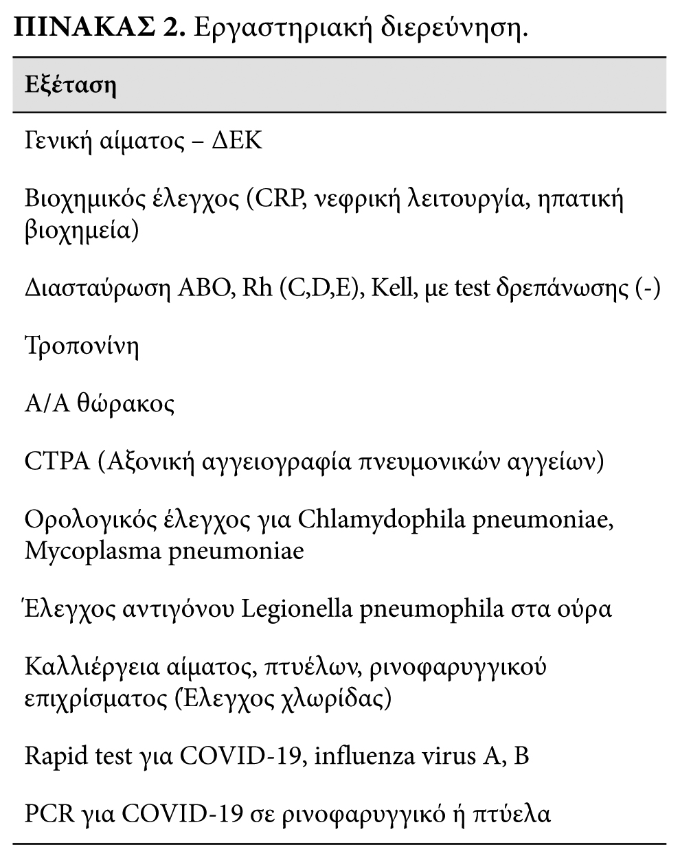 - Αντιβιοτική κάλυψη με κεφαλοσπορίνη γ΄γενιάς (IVκεφτριαξόνη 2gr άπαξ ημερησίως ή κεφοταξίμη 2gr ανά 8 ώρες) για 7-10 ημέρες και μακρολίδη (αζιθρομυκίνη 500mg άπαξ ημερησίως IV ή peros) για 5-7 ημέρες. Σε επιδεινούμενη πολυλοβώδη πνευμονία που δεν ανταποκρίνεται, προσθήκη βανκομυκίνης 1grx 2 για κάλυψη προς την κατεύθυνση MRSA.