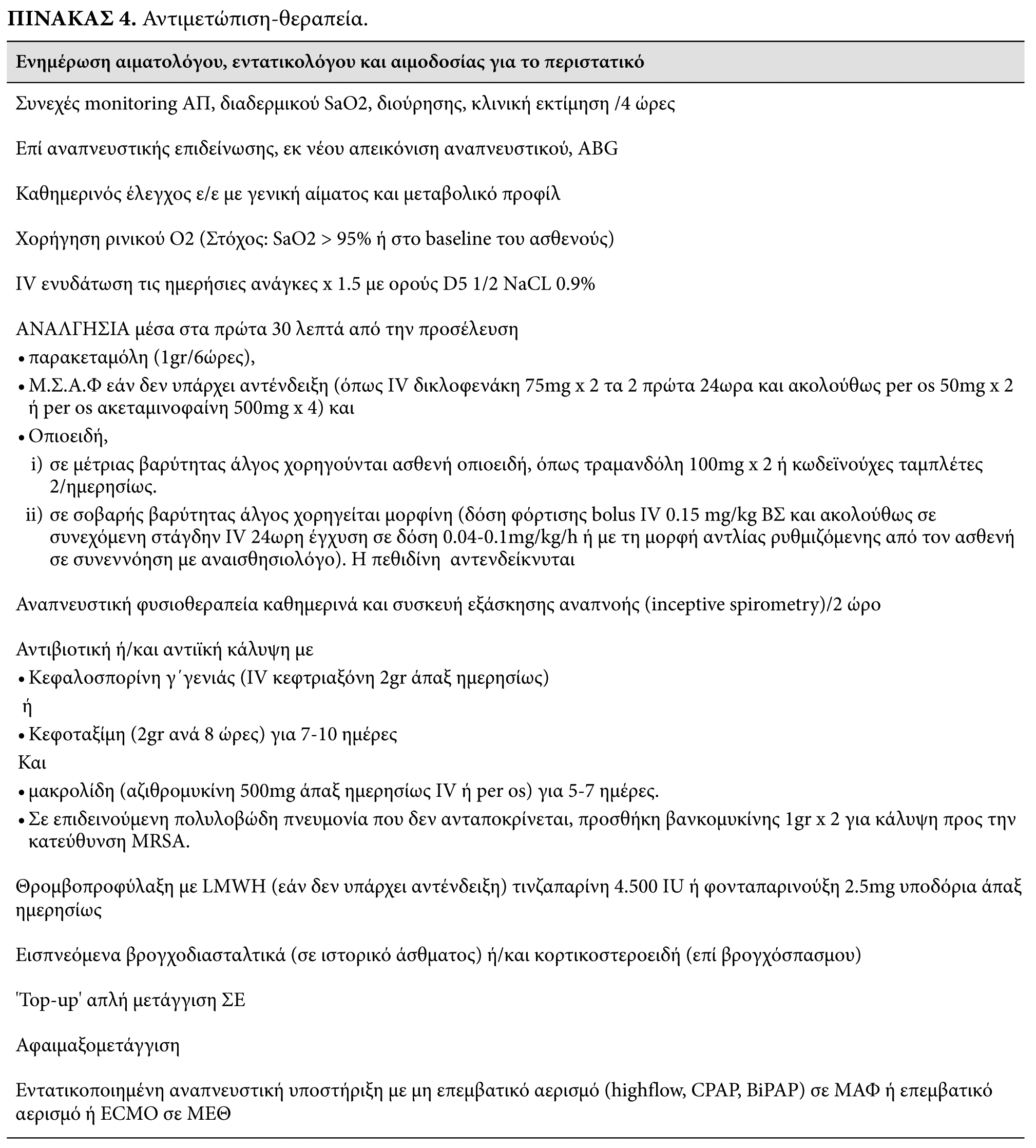 - Αναφορικά με την αναλγησία χορηγούνται: i)παρακεταμόλη (1gr/6ώρες), ii) Μ.Σ.Α.Φ εάν δεν υπάρχει αντένδειξη (όπως IV δικλοφενάκη 75mgx 2 τα 2 πρώτα 24ωρα και ακολούθως per os 50mgx 2 ή per os ακεταμινοφαίνη 500mgx 4) και iii) oπιοειδή. Σε μέτριας βαρύτητας άλγος χορηγούνται ασθενή οπιοειδή, όπως τραμανδόλη 100mgx 2 ή κωδεϊνούχες ταμπλέτες 2/ημερησίως. Σε σοβαρής βαρύτητας άλγος χορηγείται μορφίνη (δόση φόρτισης bolusIV 0.15 mg/kgBΣ και ακολούθως σε συνεχόμενη στάγδην IV 24ωρη έγχυση σε δόση 0.04-0.1mg/kg/h ή με τη μορφή patient’s control αντλίας σε συνεννόηση με αναισθησιολόγο). Η πεθιδίνη αντενδείκνυται.