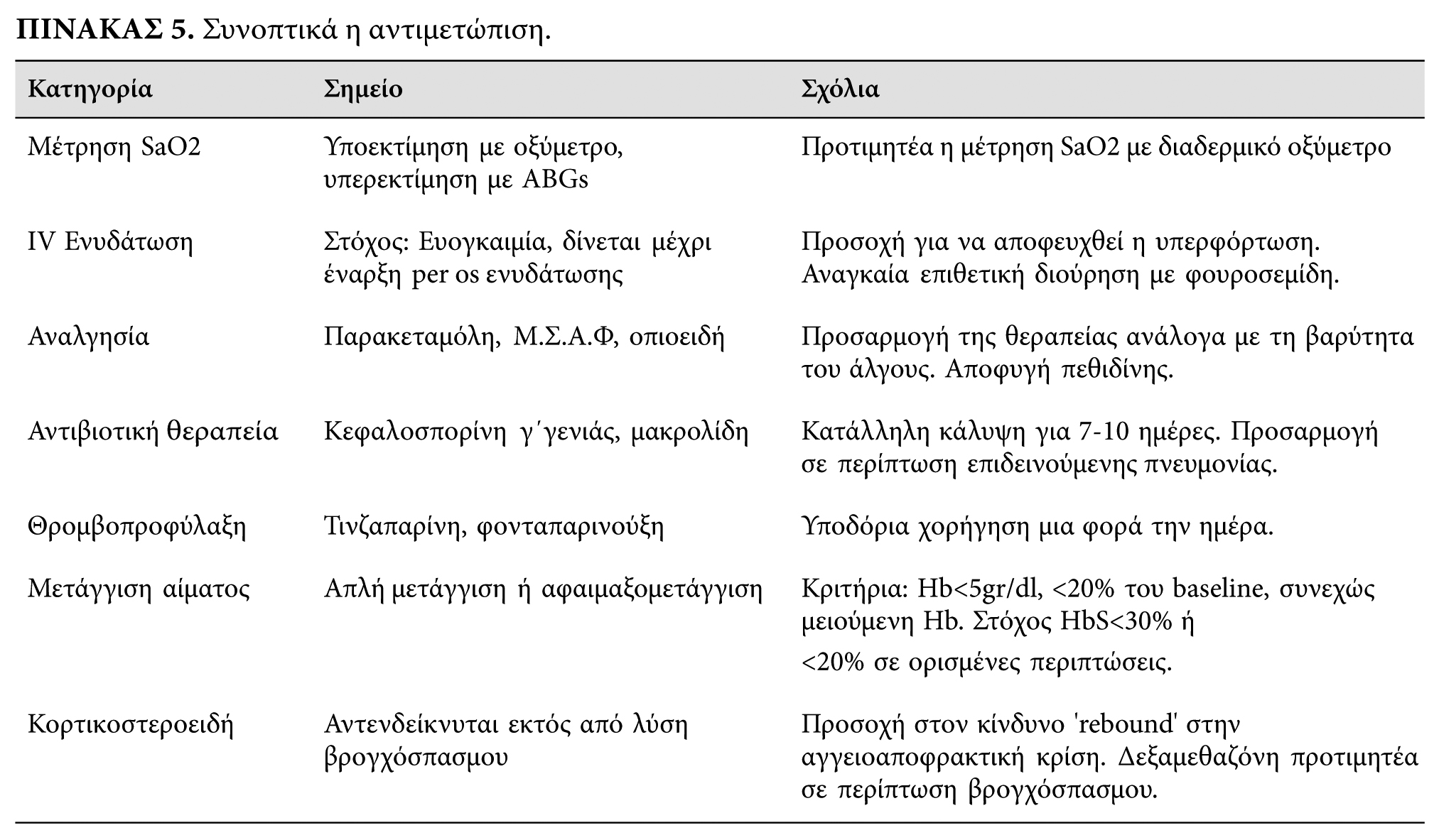 H κλινική υποψία πρέπει να τίθεται έγκαιρα, να αντιμετωπίζεται επιθετικά, ανεξαρτήτως γονοτύπου (ΗbS, HbS/β0, HbSC, HbS/β+) και να εξασφαλίζεται στενή παρακολούθηση για άμεση αναγνώριση επιδείνωσης προς οξεία αναπνευστική ή/και πολυοργανική ανεπάρκεια. Η αναπνευστική ανεπάρκεια είναι συνήθως τύπου Ι, λόγω εγκαθιστάμενου ARDS (Acute Respiratory Distress Syndrome). Δεν αποκλείεται όμως και η υπερκαπνική αναπνευστική ανεπάρκεια (εξαιτίας π.χ. εκτεταμένων ατελεκτασιών ή συνυπάρχουσας πνευμονικής εμβολής).