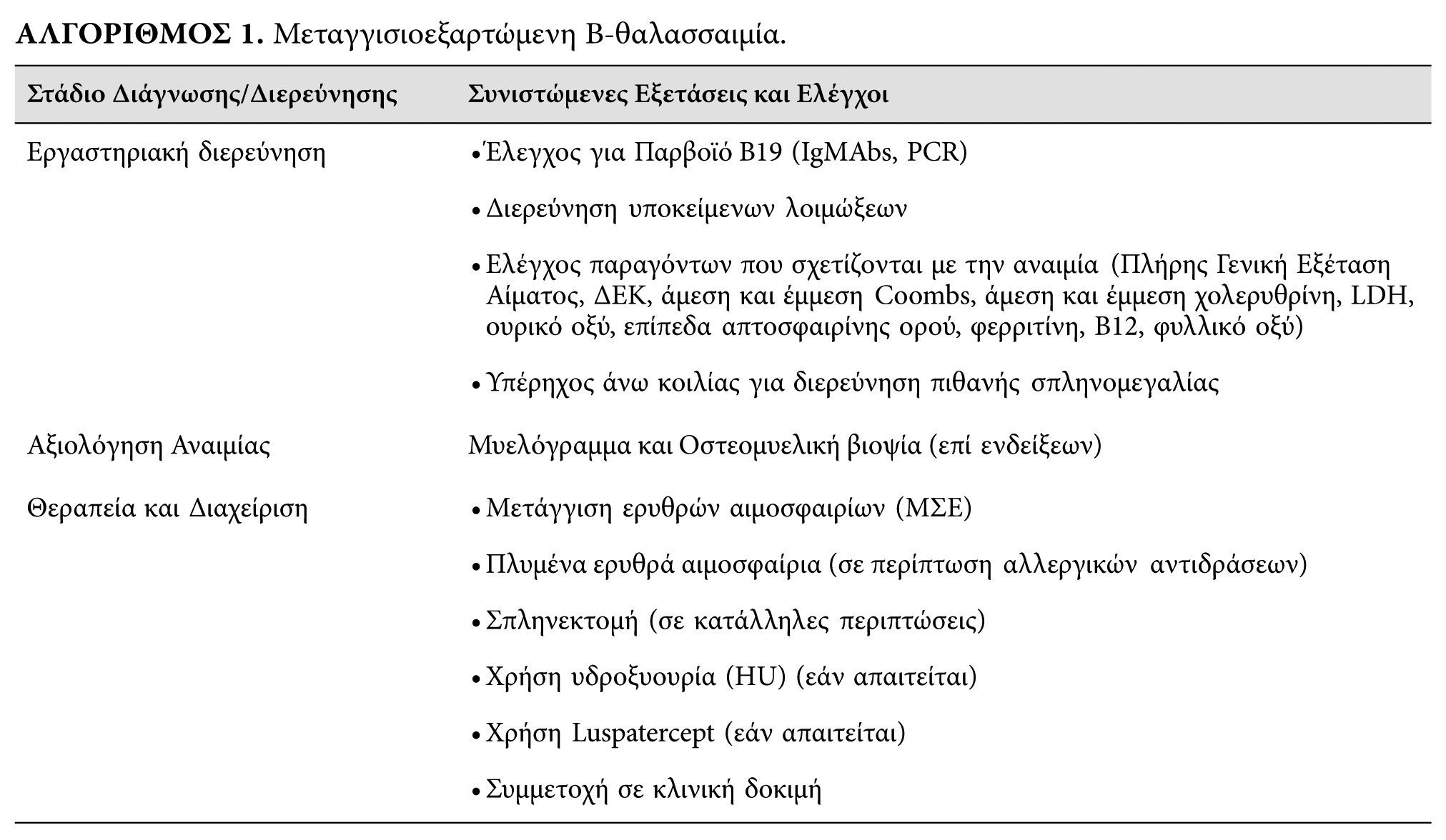Ανάλογα με την κλινική κρίση: 1. Χορήγηση Luspatercept (1-1.25 mg/kgΒΣ), 2. Χορήγηση ΜΣΕ ως ανωτέρω μαζί με την κατάλληλη αποσιδήρωση, 3. HU (με δόση ως κατωτέρω), 4. Συμμετοχή σε κλινική δοκιμή. (Αλγόριθμός 1)