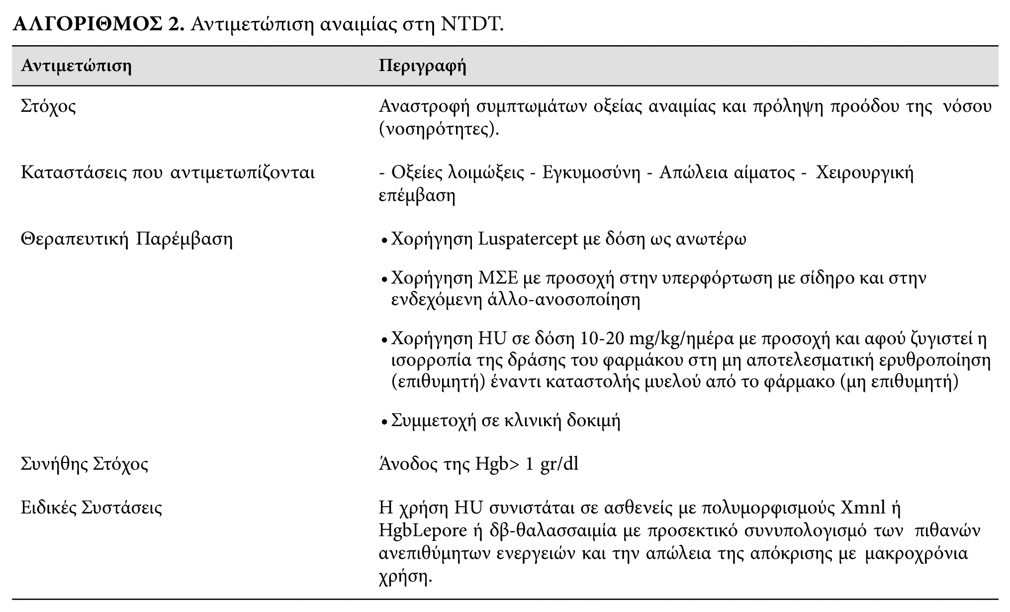 Θεραπεία οξείας αναιμίας στην NTDT, που στοχεύει στη μη αποτελεσματική ερυθροποίηση: 1. Χορήγηση Luspatercept με δόση ως ανωτέρω, 2. Χορήγηση ΜΣΕ με προσοχή στην υπερφόρτωση με σίδηρο και στην ενδεχόμενη άλλο-ανοσοποίηση, 3. Χορήγηση HU σε δόση 10-20 mg/kg/ημέρα με προσοχή και αφού ζυγιστεί η ισορροπία της δράσης του φαρμάκου στη μη αποτελεσματική ερυθροποίηση (επιθυμητή) έναντι καταστολής μυελού από το φάρμακο (μη επιθυμητή). Η χρήση HU συνιστάται σε ασθενείς με πολυμορφισμούς Xmnl του Gγ γονιδίου ή HgbLepore ή δβ-θαλασσαιμία με προσεκτικό συνυπολογισμό των πιθανών ανεπιθύμητων ενεργειών και την απώλεια της απόκρισης με μακροχρόνια χρήση. 4. Συμμετοχή σε κλινική δοκιμή.(Αλγόριθμος 2)