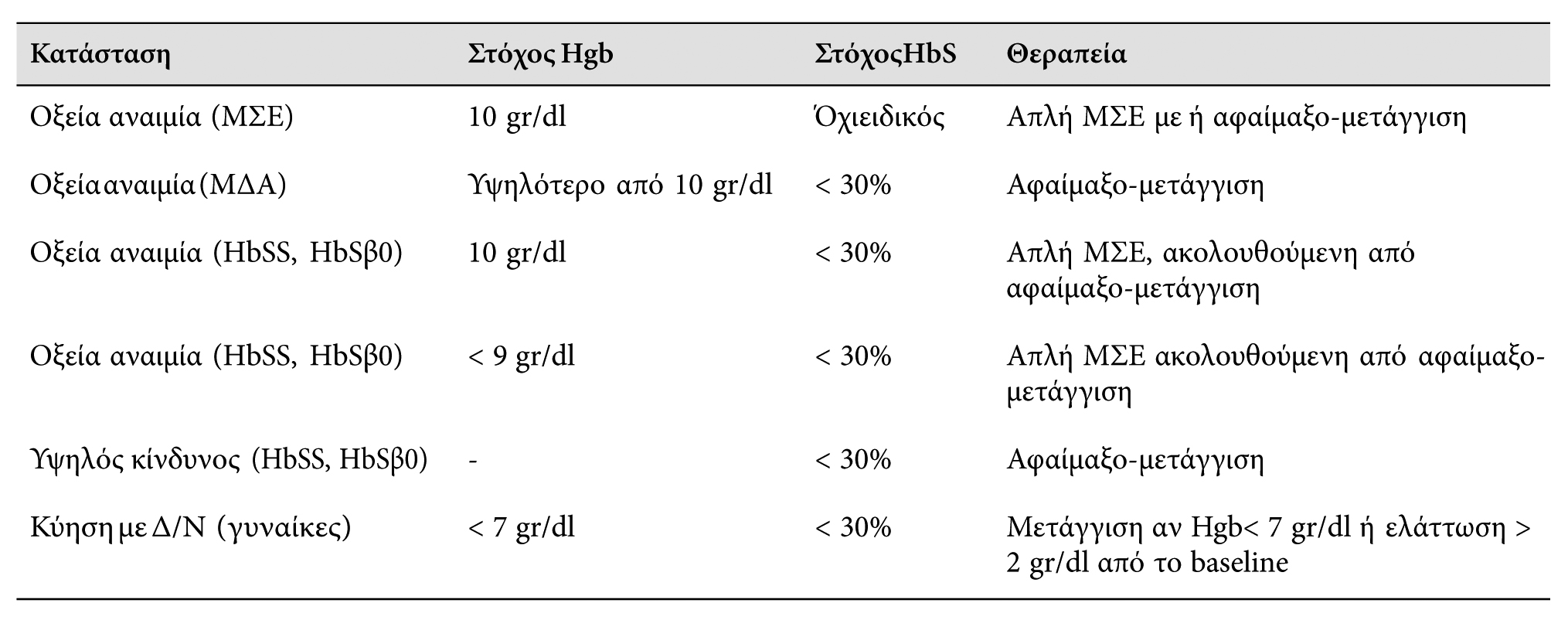 Σε οξύ θωρακικό σύνδρομο, θα πρέπει να εφαρμόζεται απλή ΜΣΕ με στόχο Hgb 10-11 gr/dl, όταν η αρχική πτώση από το baseline> 1 gr/dl ή αν ο κορεσμός του O2< 92% ή αν αυξηθούν οι απαιτήσεις σε O2. Ασθενείς με οξύ ισχαιμικό επεισόδιο θα πρέπει να λαμβάνουν αφαίμαξο- μετάγγιση για οξεία αναιμία με στόχο Hgb 10 gr/dl και HbS< 30%. Αν οι άνω ασθενείς έχουν ιδιαίτερα χαμηλή Hgb (6 gr/dl) σε έδαφος οξέος ισχαιμικού επεισοδίου, μπορεί να εφαρμοστεί αρχική απλή ΜΣΕ με επακόλουθη αφαίμαξο-μετάγγιση για να ελαττωθεί η HbS< 30%.