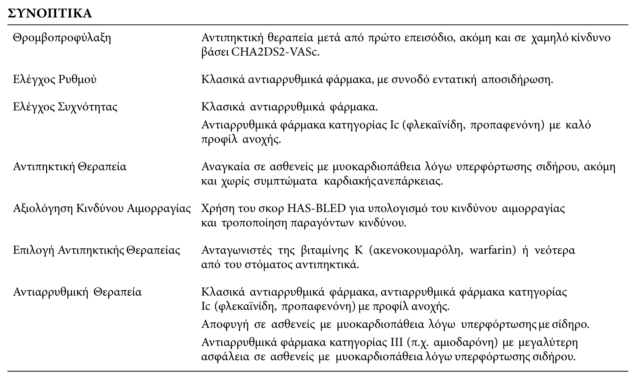 Η θεραπεία της ΚΜ σε θαλασσαιμικούς ασθενείς στηρίζεται σε τρεις κατηγορίες που αφορούν τη θρομβοπροφύλαξη με αντιπηκτική αγωγή, τη στρατηγική ελέγχου ρυθμού, και τη στρατηγική ελέγχου συχνότητας. Σχετικά με την έναρξη αντιπηκτικής αγωγής μετά από ένα πρώτο επεισόδιο ΚΜ, το CHA2DS2- VAScscore που προτείνεται από τις Ευρωπαϊκές Κατευθυντήριες Οδηγίες δεν έχει μελετηθεί σε ασθενείς με θαλασσαιμία και ίσως υποεκτιμά το θρομβοεμβολικό τους κίνδυνο, δεδομένου πως είναι αυξημένος σε σχέση με αυτόν του γενικού πληθυσμού6. Συνεπώς η χορήγηση αντιπηκτικής αγωγής σε πολυμεταγγιζόμενους θαλασσαιμικούς ασθενείς με χαμηλό κίνδυνο με βάση το CHA2DS2-VASc score (0 ή 1 για άντρες) ίσως χρειαστεί. Σε ασθενείς με μυοκαρδιοπάθεια από υπερφόρτωση σιδήρου, με επηρεασμένη συσταλτικότητα και ΚΜ, μάλλον απαιτείται χορήγηση αντιπηκτικής αγωγής ακόμα και χωρίς συμπτώματα καρδιακής ανεπάρκειας. To HAS-BLED score θα πρέπει να λαμβάνεται υπόψιν για τον υπολογισμό του αιμορραγικού κινδύνου καθώς και την τροποποίηση αναστρέψιμων παραγόντων κινδύνου αιμορραγίας (π.χ. αρτηριακή υπέρταση, κατάχρηση αλκοόλ). Όσον αφορά την επιλογή της αντιπηκτικής αγωγής, αυτή συμπεριλαμβάνει τη χορήγηση ανταγωνιστών βιταμίνης-Κ (ασενοκουμαρόλη, βαρφαρίνη) καθώς και τη χρήση νεότερων από του στόματος αντιπηκτικών (ριβαροξαμπάνη, απιξαμπάνη, δαβιγατράνη). Μελέτες ασφάλειας και αποτελεσματικότητας των φαρμάκων αυτών δεν έχουν διεξαχθεί σε ασθενείς με θαλασσαιμία, ενώ τα δεδομένα περιορίζονται σε μικρές σειρές παρατήρησης.7 Συστήνεται η υιοθέτηση των αλγορίθμων της Ευρωπαϊκής Καρδιολογικής Εταιρίας για τον γενικό πληθυσμό όσον αφορά την επιλογή φαρμάκου και την δοσολογία.6 Συγκεκριμένα τα νεότερα από του στόματος αντιπηκτικά συστήνονται έναντι των ανταγωνιστών βιταμίνης-Κ με εξαίρεση τους ασθενείς με μηχανική προσθετική βαλβίδα ή μέτρια-προς-σοβαρή στένωση μιτροειδούς.6
