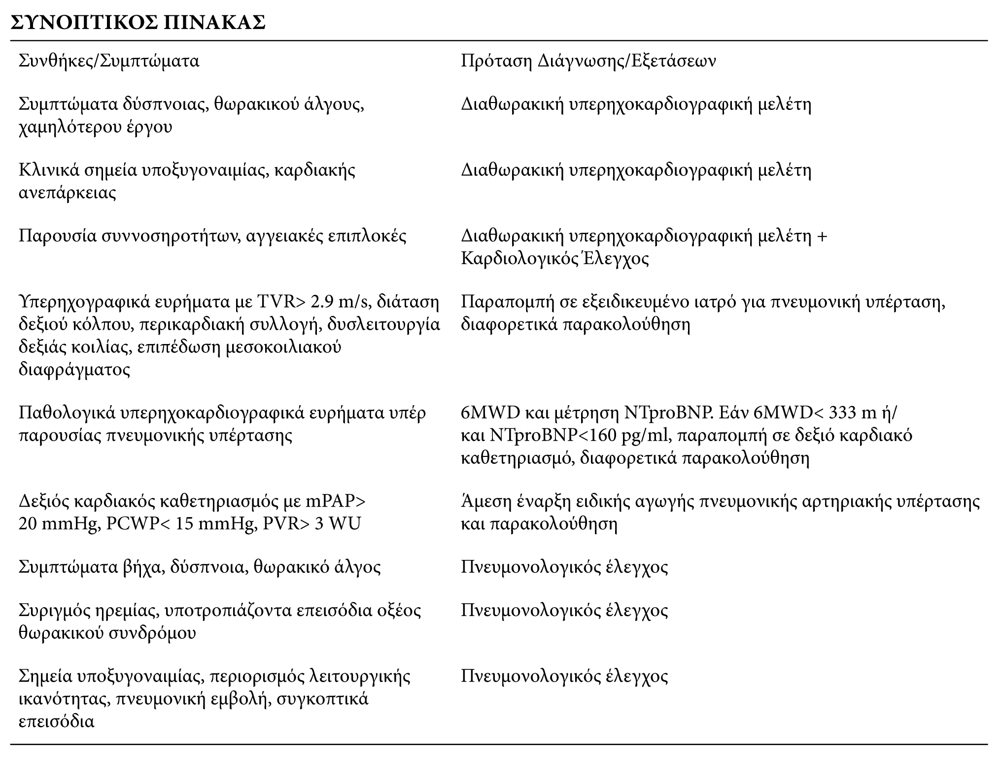Σε περίπτωση που τα υπερηχογραφικά ευρήματα των ασθενών περιλαμβάνουν TVR > 2.9 m/s ή/και διάταση δεξιού κόλπου ή/και περικαρδιακή συλλογή ή/και δυσλειτουργία δεξιάς κοιλίας ή/και επιπέδωση μεσοκοιλιακού διαφράγματος, συνιστάται η παραπομπή σε ιατρό εξειδικευμένο στην πνευμονική υπέρταση. Διαφορετικά, συνιστάται παρακολούθηση του ασθενούς σε τακτικό έλεγχο.