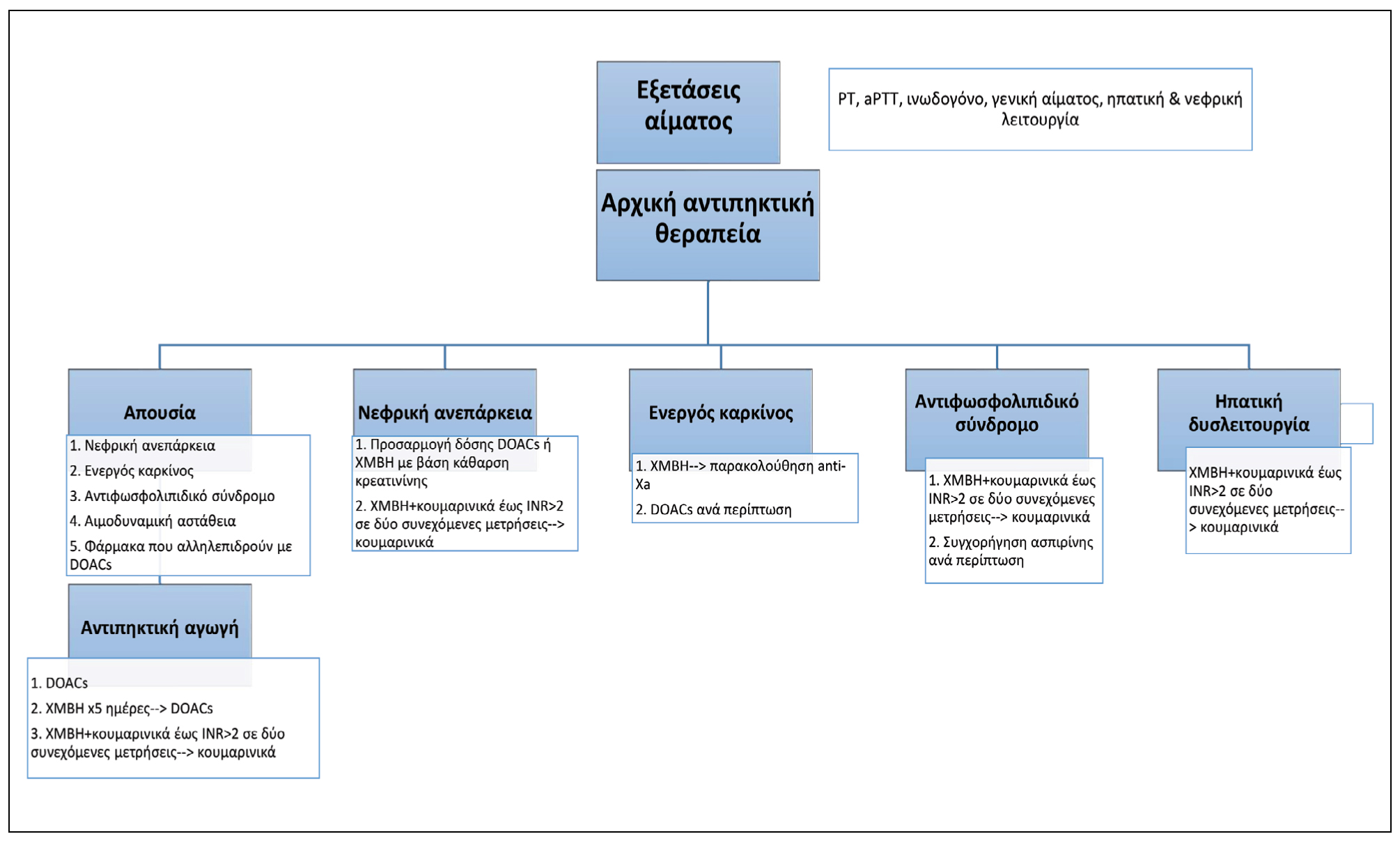 Συντμήσεις: aPTT: activated partial thromboplastin time, INR: international normalized ratio, DOACs: direct oral anticoagulants, PT: prothrombin time, ΦΘΕ: φλεβική θρομβοεμβολική νόσος, ΧΜΒΗ: χαμηλού μοριακού βάρους ηπαρίνη.