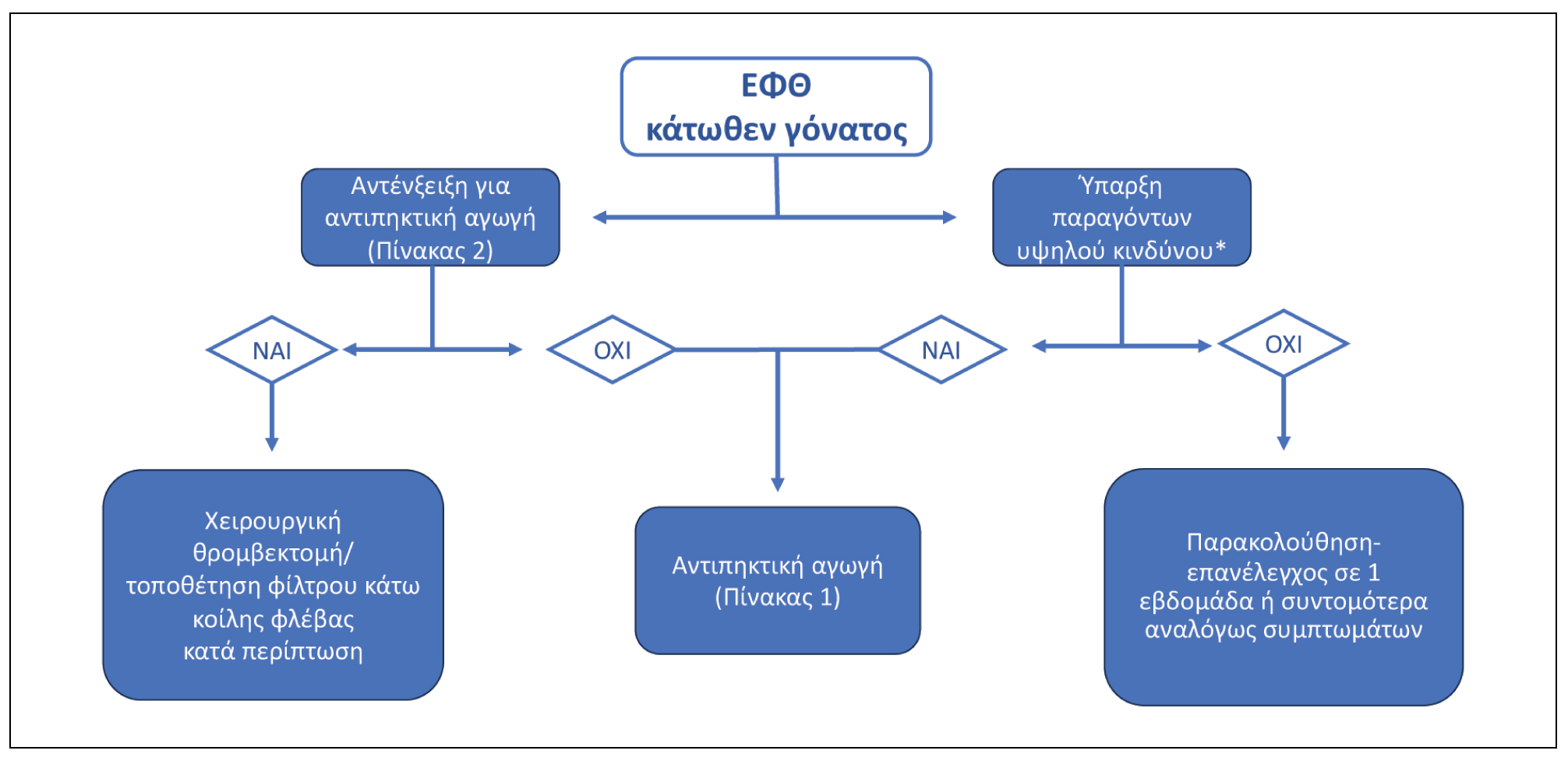 *Ύπαρξη παραγόντων υψηλού κινδύνου: α) Κίνδυνος επέκτασης άνωθεν του γόνατος, β) Εκτεταμένη θρόμβωση, όπως παρουσία θρόμβωσης σε πολλαπλές φλέβες, >5cm σε μήκος, >7mm σε διάμετρο, γ) Προηγούμενο ιστορικό θρόμβωσης, δ) Μη προκλητή θρόμβωση