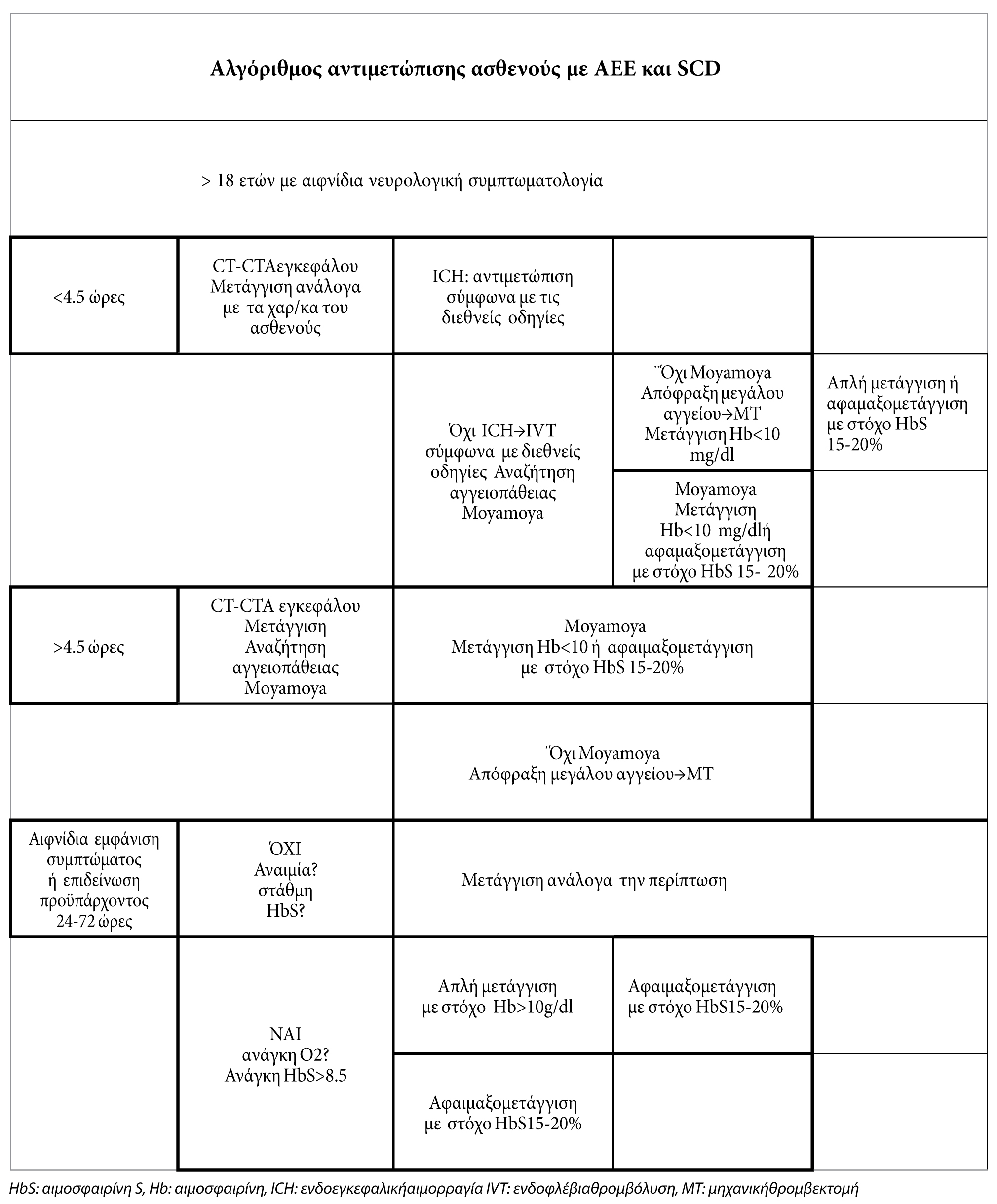 - Για τη μηχανική θρομβεκτομή σε ασθενείς με ΙΑΕΕ και SCD δεν υπάρχουν μελέτες που να τεκμηριώνουνε το όφελος σε αυτή την ομάδα ασθενών. Εντούτοις στο γενικό πληθυσμό με ΙΑΕΕ και απόφραξη μεγάλου αγγείου είναι πλήρως τεκμηριωμένο το όφελος αυτής της θεραπείας και αυτό θα πρέπει να λαμβάνεται υπόψιν στις θεραπευτικές αποφάσεις. Σε κάθε περίπτωση είναι αναγκαίο και απαραίτητο να υπολογίζεται το όφελος αλλά και ο κίνδυνος από την ενδοαυλική παρέμβαση δεδομένης της αυξημένης συχνότητας αγγειοπάθειας και συνδρόμου Moyamoya τους ασθενείς αυτούς.